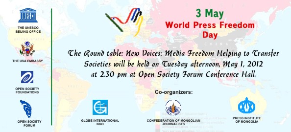 New Voices: Media Freedom Helping to Transfer Societies on May 1, 2012 at 14.30 in the Conference Hall of OSF, Mongolia. Round table will discuss a wide range of media freedom issues under the topics: Media Freedom Has the Power to Transform Societies, Difficulty in the Access to Quality Information Undermines Media Freedom and: Challenges to Media in a New Environment. Globe International has launched an online discussion on these topics at www.gic.mn on April 10, 2012 and outcomes will be presented to the round table by discussion facilitators: D.Narantuya, Deputy director of News Agency, J.Batbaatar, Head of Journalism Department of University of Education, Ph.D and D.Tserenjav, Media expert.