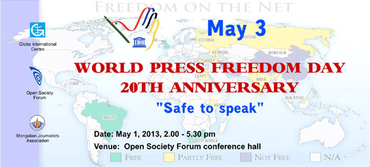 Date: May 1, 2013, 2.00 - 5.30 pm 2.00 - 2.05 Opening speech 2.05 - 2.30 Mongolian Media Freedom in 2012 Development of free media culture in Mongolia 2.30 - 3.20 Ts.Dashdondov, journalist, Mongolian honored cultural worker Mongolian media today 3.20 - 4.10 Statistics data of the Mongolian media Digital environment and freedom of expression 4.10 - 5.00 New technology, new opportunity to express oneself 5.00 - 5.30 Media Freedom Award ceremony |