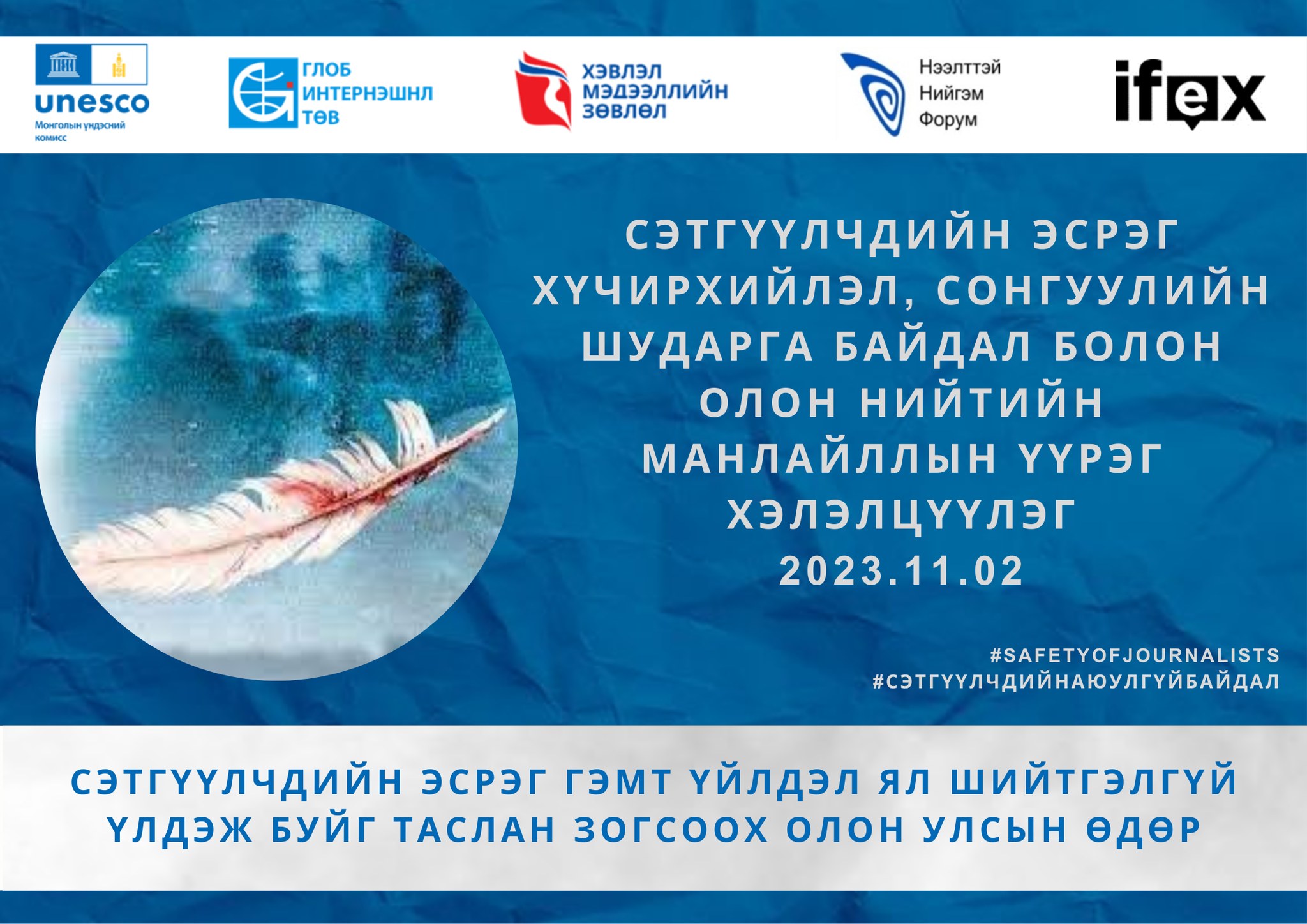 The Globe International Center with support of Open Society Forum of Mongolia and IFEX in cooperation with Mongolian National Commission of UNESCO and Media Council of Mongolia organized the “Discussion on topic: violence against journalists, the integrity of elections, and the role of public leadership” to celebrate International Day to End Impunity for Crimes against Journalists at 10.00-13.00 on 02 November.