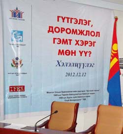 The discussion titled “Are defamation and insult crime?” was held on December 12, 2012 at the Citizens` Hall under the Office of the President. It was supported by US Embassy in Ulaanbaatar and co-organized by Globe International, Office of the President, Legal Standing committee and State Structure`s Standing committee, in the framework of the Ask! campaign, during which all election candidates were inquired about their view of the decriminalization of press offences, implemented since June, 2012 with the IFEX.