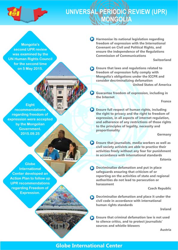 On May 5, 2015, the UN Human Rights Council has reviewed the Mongolian national submission for the Human Rights Universal Periodic Review (UPR) in Geneva and eight recommendations regarding freedom of expression made by Switzerland, United States of America, France, Germany, Estonia, Czech Republic, Ireland and Austria to align the domestic legislation with international standards, to decriminalize defamation, to adopt the law on protecting confidential sources, to guarantee the online freedom and provide and to provide the independence of the regulatory body.