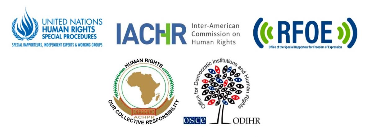 Эвлэлдэн нэгдэх ба жагсаал, цуглаан хийх эрх чөлөөний асуудлаарх НҮБ-ын Тусгай илтгэгч, Америк дундын Хүний эрхийн Комисс (IACHR) ба уг Комиссын үзэл бодлоо илэрхийлэх эрх чөлөөний Тусгай илтгэгч, Иргэдийн болон хүний эрхийн Африкийн Комиссын Африк дахь нөхөн олговрыг зохицуулах төв ба Хүний Эрх Хамгаалагчдын асуудлаарх Тусгай илтгэгч, (ACHPR) ба ЕАБХАБ-ын Ардчилсан институц, хүний эрхийн алба (ODIHR);