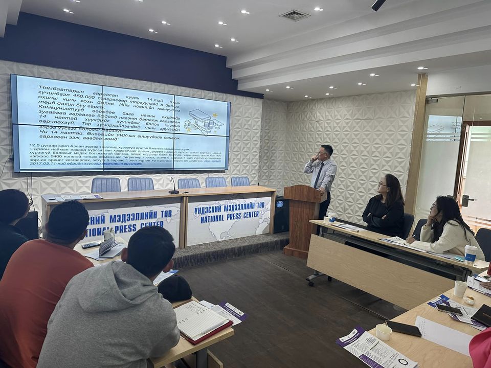 Сургалтаар үзэл бодлоо илэрхийлэх эрх чөлөө ба хэвлэлийн эрх чөлөөний олон улсын хэм хэмжээ, Эрүүгийн хуулийн нэмэлт өөрчлөлтийн хуудийн төсөл, нийтийн мэдээллийн ил тод байдлын тухай хууль, Эрүүгийн хуулийн нэмэлт төсөл буюу 13.15 (Доромжлох) заалт ба үндэсний эрх зүйн зохицуулалтын онцлог зэрэг сэдвийн хүрээнд сургалтыг зохион байгууллаа.