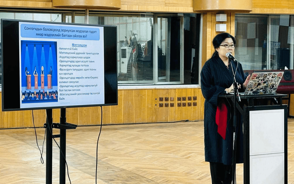 Сургалтаар ардчилсан сонгууль яагаад хэрэгтэй эсэх, сэтгүүлчдийн аюулгүй байдал, хиймэл оюун ухааны хэрэглээ сонгуулийн үр дүнд хэрхэн нөлөөлөх, хэвлэл мэдээллийн хэрэгсэл хуулийн хүрээнд сонгуулийн сурталчилгаа нэвтрүүлэхэд юунд анхаарах вэ зэрэг сэдвийн хүрээнд мэдээлэл өгөв.