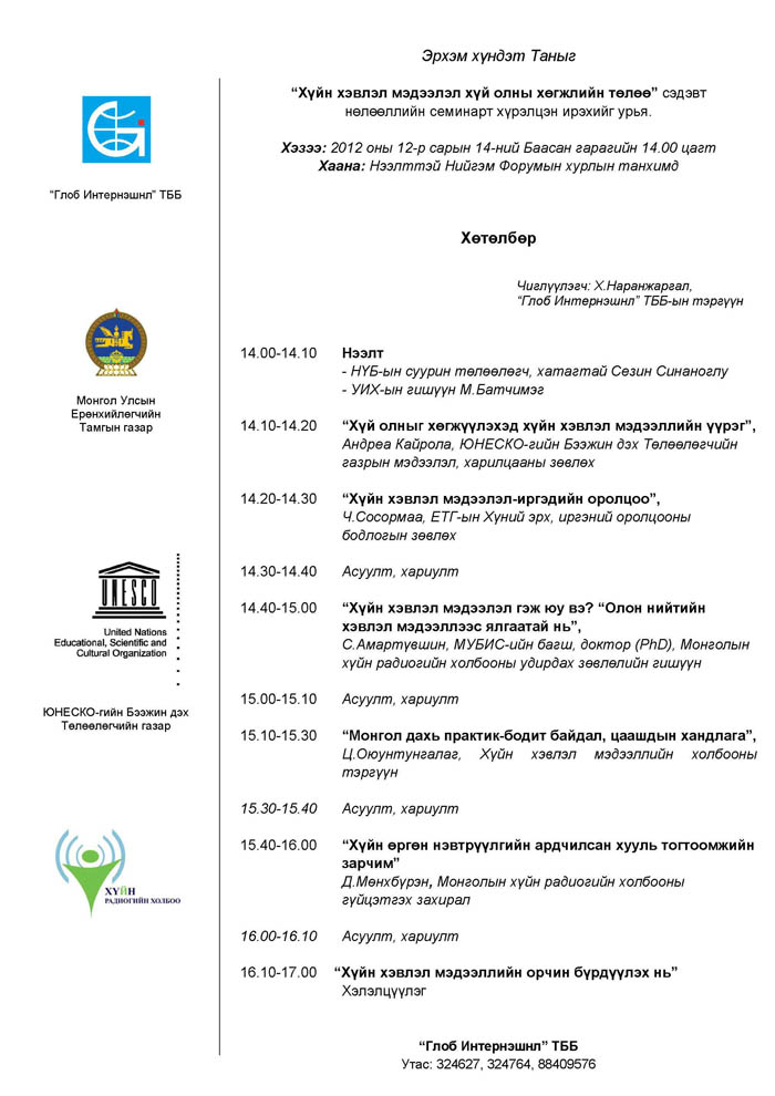 “Хүйн хэвлэл мэдээлэл хүй олны хөгжлийн төлөө” сэдэвт нөлөөллийн семинар болно