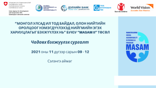 Швейцарын хөгжлийн агентлаг, Нийгмийн эгэх хариуцлагын дэлхийн түншлэлээс санхүүжүүлж, Дэлхийн Банкнаас хэрэгжүүлж буй “Монгол Улсад ил тод байдал, олон нийтийн оролцоог нэмэгдүүлэхэд нийгмийн эгэх хариуцлагыг бэхжүүлэх нь” буюу МАСАМ 2 төслийн хүрээнд “Төсвийн үйл явцад нийгмийн эгэх хариуцлагын ойлголт, арга хэрэгслүүдийг ашиглах нь” цахим сургалтад Сэлэнгэ аймгийн төрийн болон иргэний нийгмийн байгууллагуудын болон иргэдийн төлөөлөл нийт 30 хүн оролцлоо. Сургалтад оролцогчид иргэн-иргэний нийгмийн байгууллага-төрийн байгууллагын уялдаа холбоо сайтай байж, хамтран ажиллах нь чухал болохыг онцлов. Тус сургалтыг Сэлэнгэ аймгийн Засаг даргын Тамгын газар болон “Эерэг өөрчлөлтийг хамтдаа” ТББ-тай хамтран зохион байгуулав.