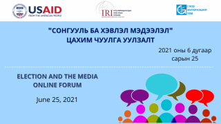 Глоб Интернэшнл төв (ГИТ)-өөс “Сонгууль ба хэвлэл мэдээлэл” цахим чуулга уулзалтыг 2021 оны 6 дугаар сарын 25-ны өдөр зохион байгууллаа.Төслийн хэрэгжүүлэгч, БНОУХ-ийн Монгол дахь суурин төлөөлөгч Крейг Кастанья сонгуулийн үеэрх шударга, ёс зүйт хэвлэл мэдээллийн үүргийг онцлоод, чанартай сэтгүүл зүйн хөгжилд оруулж буй тус төслийн хувь нэмрийг онцлов.