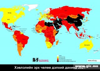 “Хил хязгааргүй сурвалжлагчид” (RSF) байгууллагын 2021 оны индексээр Монгол Улс өнгөрсөн жилийнхээс 5 байраар ахиж 68-д жагсав. “Хил хязгааргүй сурвалжлагчид” (RSF) байгууллагын 2021 оны индекс: Ази, Номхон далайг цагдан хяналт (цензур), хуурамч мэдээллийн дайрлага нөмрөв.