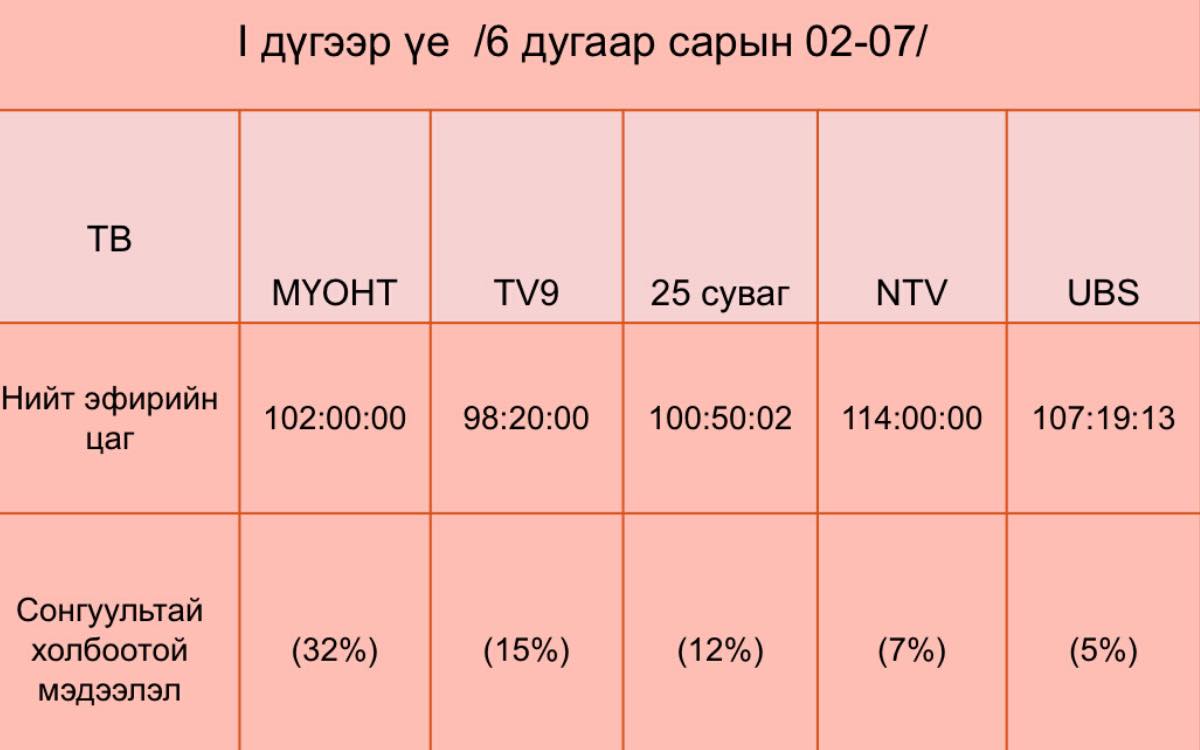 1. Судалгааны хугацаанд 5 телевизийн 552 цаг 29 минут 15 секундын нэвтрүүлэгт мониторинг хийснээс 73 цаг 04 минут 29 секунд нь буюу 14% нь сонгуультай холбоотой мэдээлэл байв.
